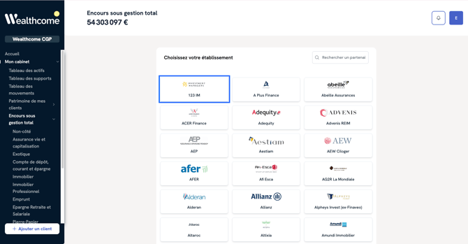 Une fois le rattachement enregistré par 123 IM (généralement effectif dès le lendemain), vos encours et opérations 123 IM apparaîtront automatiquement dans WealthPro, dans la section : « Agrégation » > « Mes partenaires »