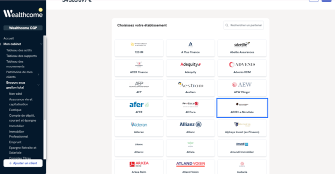 Une fois la confirmation d'AG2R du bon envoi de vos flux vers Wealthcome, connectez-vous à votre espace WealthPro, puis dans la barre latérale gauche accédez à :