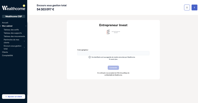 Une fois votre demande d'agrégation réceptionnée et confirmée par votre interlocuteur Entrepreneur Invest ainsi que votre code agrégateur obtenu, connectez vous à votre espace WealthPro pour finaliser votre connexion.