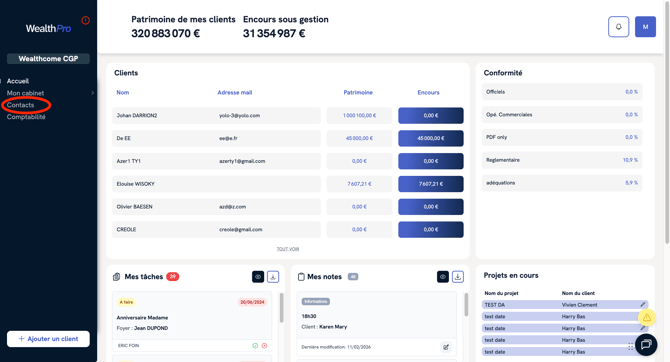 - Rendez-vous dans l’onglet Contacts et sélectionnez le client concerné