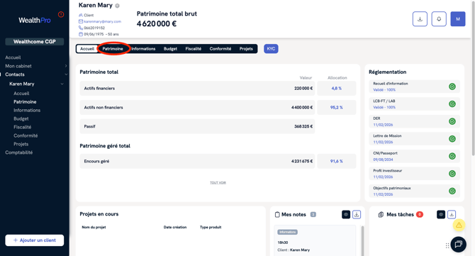 Vous accédez alors à une vue globale du patrimoine de votre client.