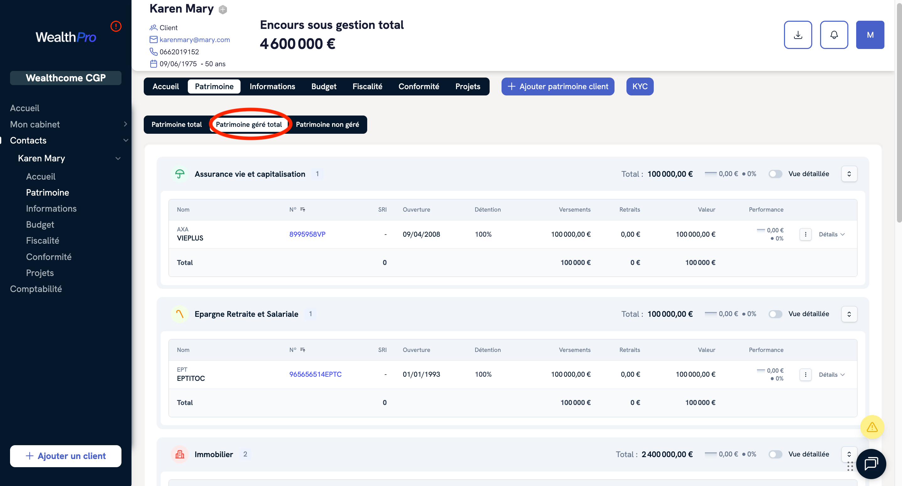 Vous accédez alors à une vue globale du patrimoine géré de votre client.