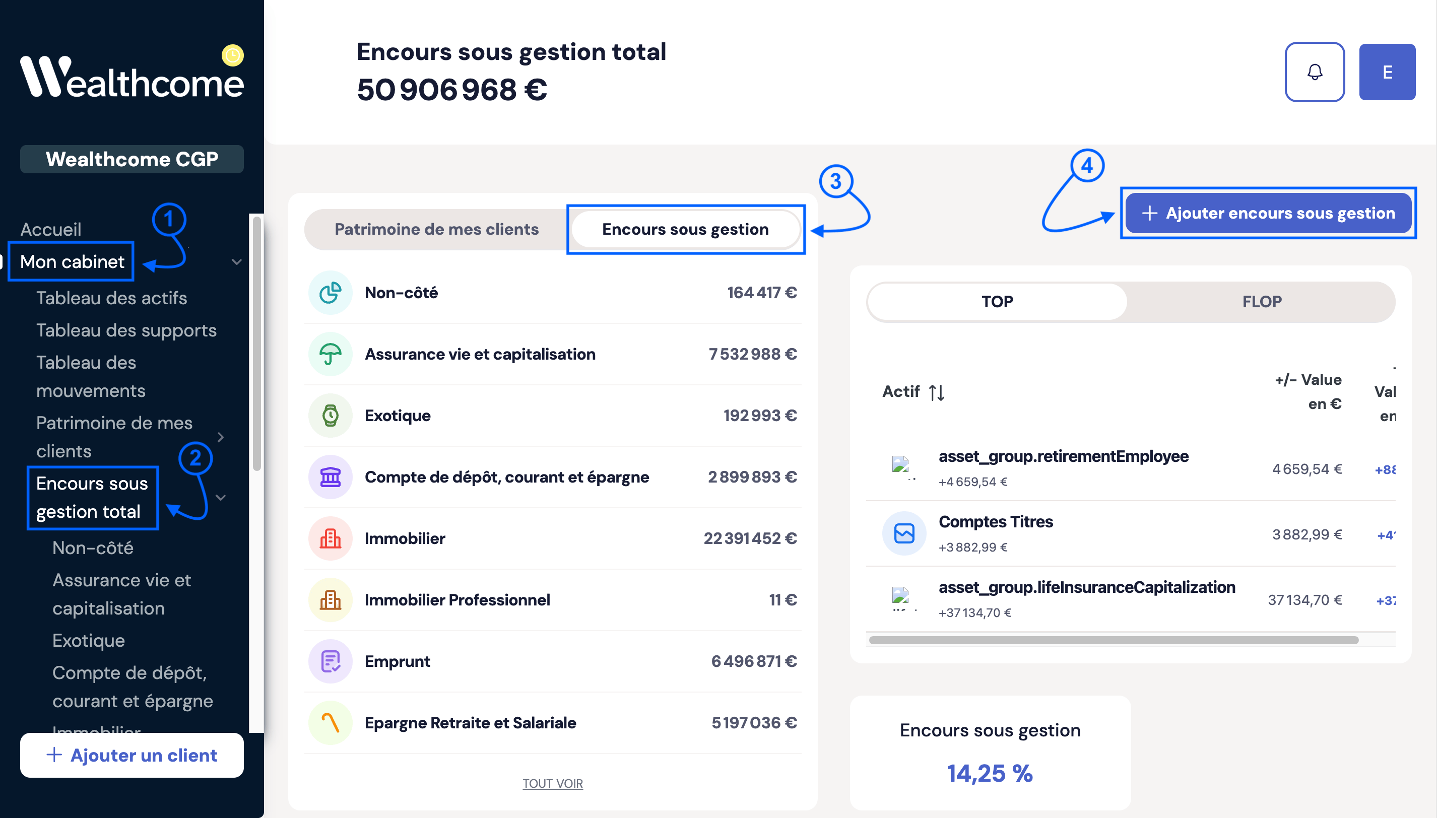 « Mon cabinet (1) » > « Encours sous gestion total (2) » > « Encours sous gestion (3) »,
