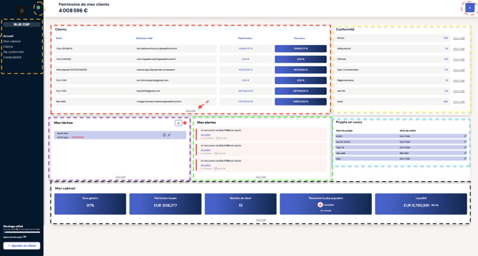 Celle ci vous sert à visualiser votre encours total ou sous gestion et agréger du patrimoine depuis la partie “ Mon cabinet”.