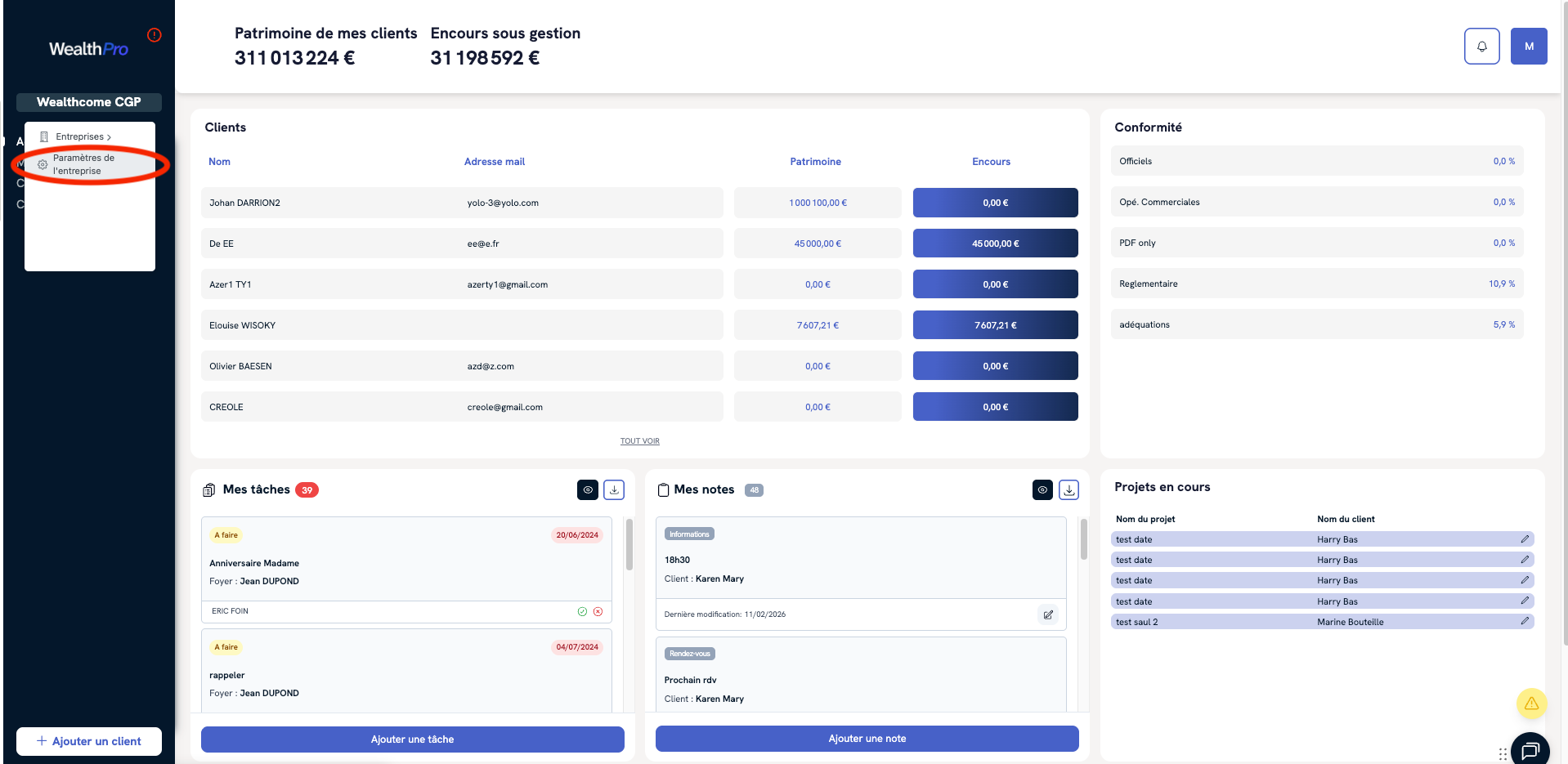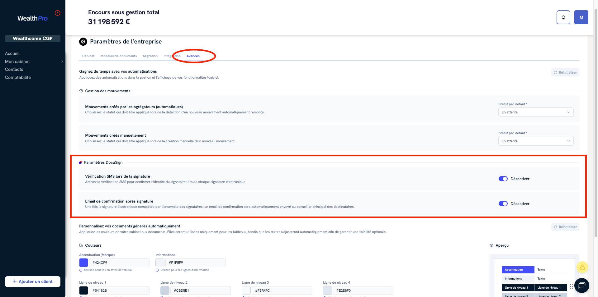 Vous avez la possibilité de configurer les paramètres liés à la signature électronique DocuSign directement depuis votre espace WealthPro.