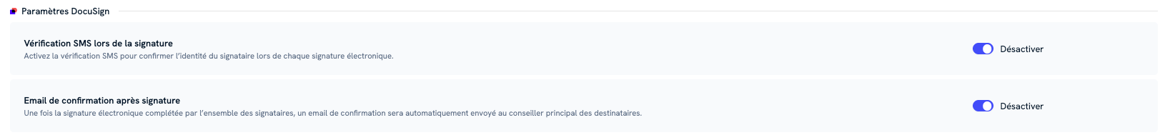 Ces réglages vous permettent de renforcer la sécurité des signatures et d’automatiser la communication post signature.