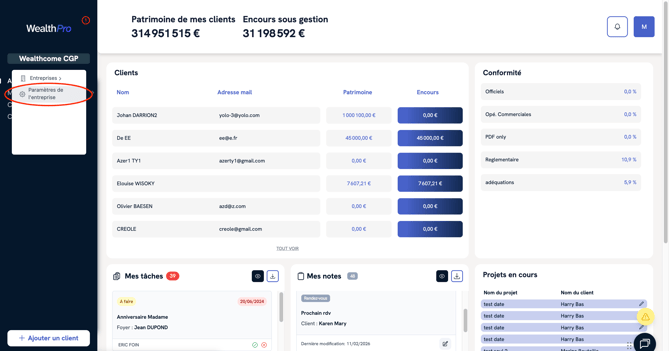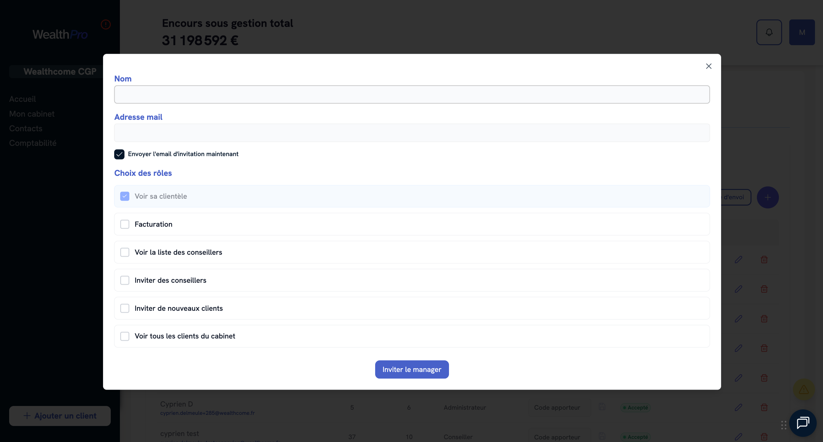 Dans la limite du nombre de sièges compris dans votre abonnement, vous avez la possibilité d’ouvrir des accès WealthPro à vos collaborateurs.