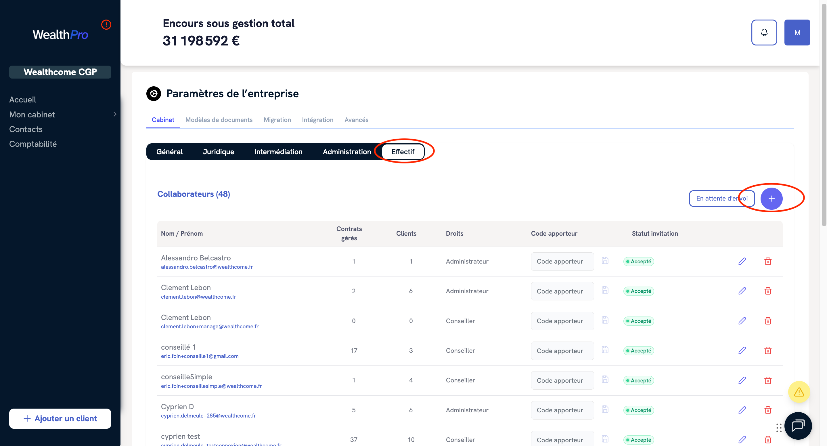 - Aller dans l’onglet “cabinet” puis dans la section “effectif”